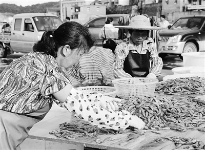 图为玉环市栈头码头,渔妇正在分拣鹰爪虾、中华管鞭虾。通讯员吴达夫 摄