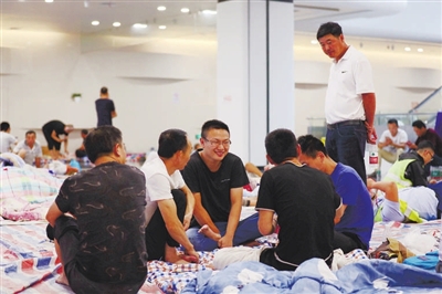 本报讯 见习记者邹伟锋摄影报道 8月9日晚9点左右,台风“利奇马”登陆前夕,风雨肆虐,杭州市职工文化中心3楼的廊道上,不时传来欢声笑语,原来,600多名外来务工人员被临时安置在这里,职工文化中心成为安心的“避风港”。