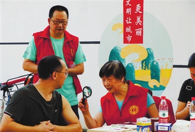 | 省劳模陈云芳(右)现场提供医疗服务。 |