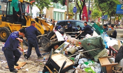 他们分成12个小组,在古城清扫垃圾,并用铲车清运,忙到晚上9点。