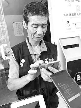 小区再生资源收集点是用钢制建材紧贴建筑外立面搭设的十多平方米的空间,没装空调,酷夏中的这间“环保小屋”让人觉得闷热。老林把台秤搬到门口,迎接他的“主顾”。小区里的大妈大伯零零散散地过来,带来一摞废纸板,或者几片破碎的玻璃。老林过秤的时候,额头的汗水滴落在纸板、玻璃上。大妈说,“老林,擦把汗再称吧,不着急。”老林一边回复着“不碍事,不碍事”,一边忙着算重量、换积分。