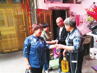 | 今年“五一”,吕云兰(左一)自备米、油等生活用品慰问困难老人家庭。 |