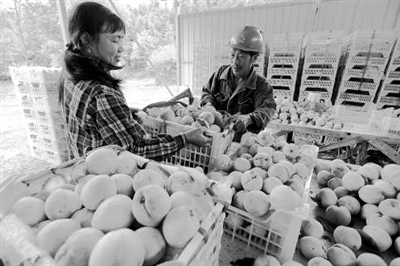 农场主张华荣相告,开化山好水好,所以桃子鲜甜可口,销路好。今年山地桃子总产量可达4万余公斤。图为员工正在将桃子装箱准备外运销售。