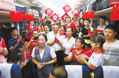 本报讯 记者胡翀报道 “祖国万岁”……8月29日晚,K209次甬广列车车厢一角,一位乘客的口号,迅速得到了所有乘客的响应。一时间,“祖国万岁”“我爱中国”的激情呐喊回荡在整个车厢,久久不能平静,和点燃的爱国热情,和挥动的五星红旗,瞬间融入到《我和我的祖国》优美的旋律中,共同构成了一幅激荡人心的红色画面。
