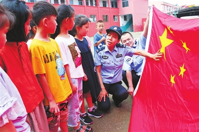 昨日上午,台州市公安局椒江分局海门派出所民警来到辖区民工学校——东门小学,开展“开学第一课 学国旗知识”活动,为一年级新生讲解国旗知识,教育孩子们从小热爱祖国,激发他们的爱国热情。