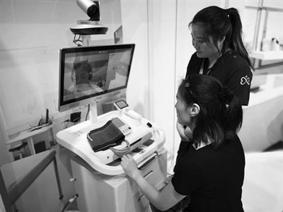 “医生,我最近嗓子痛、有痰。”张女士向屏幕里的医生反映病情,现场的护理人员操作医学镜,对着张女士的咽喉部“扫一扫”,同时,其喉部情况就呈现在连线医生面前。