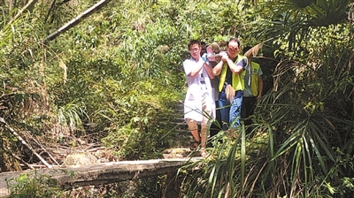 正值中午时分,烈日炎炎,让人感觉热得喘不上气,三名急救人员二话没说就把陈先生安置好,抬起担架赶紧下山。