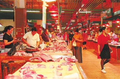 昨日,记者走访杭州部分农贸市场了解到,生猪和猪肉行情受各种因素影响波动不断。肉摊摊主们纷纷表示,国家正进一步采取措施,促进生猪生产、保障市场供应,他们对于稳定肉价信心满满。图为农贸市场肉摊销售场景。