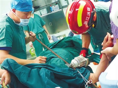 医院里,手外科主任吴志卿及手外科团队为郑某实施了“右上臂清创+异物取出+血管神经肌腱探查”手术,因为钢筋长度达一米左右,需要消防队员进行再次切割。由于刺穿郑某手臂的钢筋太粗,消防队员迅速用机动液压剪切钳对钢筋进行剪切,余彤缓缓地加大剪切钳油门,通过几次调整钳口位置,很快剪断了体外近一米长的钢筋。