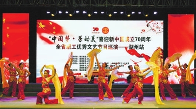 为大力弘扬劳模精神、劳动精神、工匠精神,致敬为浙江经济发展作出贡献的劳动者,省总工会以“中国梦·劳动美”为主题,举办喜迎新中国成立70周年全省职工文艺巡演。近日该巡演走进湖州,舞蹈、杂技、合唱等12个精彩节目,为湖州市广大职工群众送上了一场文化盛宴。见习记者邹伟锋 摄