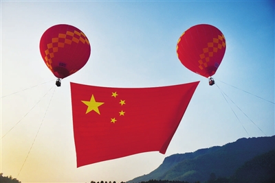 近日,武义大斗山飞行营地用热气球把一面巨幅国旗升到空中,庆祝新中国成立70周年。