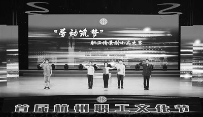 | 前不久,在杭州市职工文化中心五一剧场举行的“劳动筑梦”职工情景剧小品大赛。 |