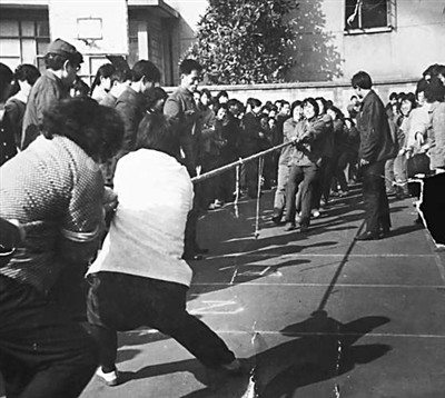 | 上世纪七八十年代,文化宫组织全市职工参加各类文体活动。图为篮球场上进行拔河比赛。 |