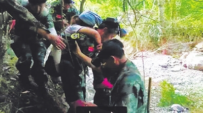 | 救援人员将受伤驴友从山上背下来。 (根据救援队提供视频剪辑) |