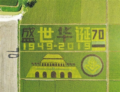 近日,在温州种子种苗科技园的彩色水稻展示示范基地里,由彩色水稻组成的“盛世华诞”图案在航拍下壮丽展现,正在参观的温州科技职业学院农业与生物技术学院学生也摆出了“70”的造型。