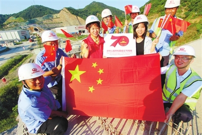 昨日,杭绍台铁路台州市路桥区螺洋街道上寺前村建设现场,铁路建设者和上寺前村的党员、群众一起与国旗合影,同唱歌曲《我和我的祖国》《红旗飘飘》,喜迎中华人民共和国成立70周年。