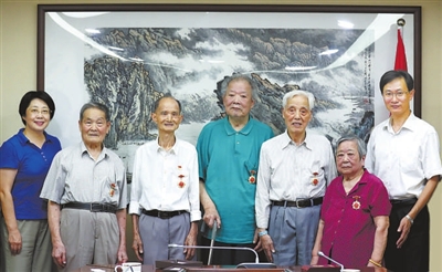 省总工会副主席张卫华、省总工会相关处室负责人等陪同慰问。图为张才方(右一)和张卫华(左一)与戴上光荣纪念章的省总机关离休干部代表合影。见习记者邹伟锋 摄影报道