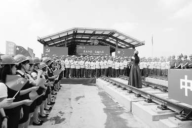 在杭海城际海宁西高铁站铁轨之上、机车之前,杭海城际筑路人动情歌唱,用歌声向祖国母亲告白,全体党员还重温了入党誓词。