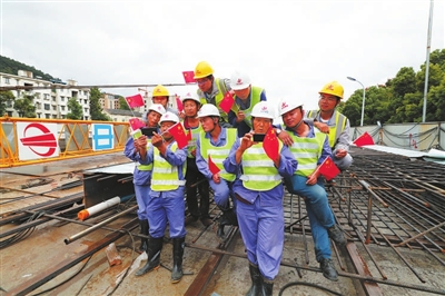 | 杭州地铁3号线建设者在施工现场用手机观看庆祝大会直播。 |