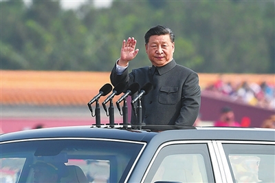 雄壮的军乐声中,习近平乘车沿着宽阔的长安街,依次检阅15个徒步方队、32个装备方队。近15000名受阅官兵整齐列阵、英姿勃发,580台受阅装备在阳光下熠熠生辉。这是中国特色社会主义进入新时代的首次国庆阅兵,也是共和国武装力量改革重塑后的首次整体亮相。