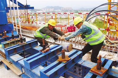 10月6日,杭绍台铁路台州市路桥区路段施工现场,铁路建设者们舍小家、为国家,放弃国庆假日,奋战在一线进行施工作业。杭绍台城际铁路连接杭州、绍兴、台州三地,是省内沟通杭州都市区与温台沿海城市群的一条快捷通道,预计将于2021年建党100周年时建成通车。通讯员蒋友青、朱岱 摄