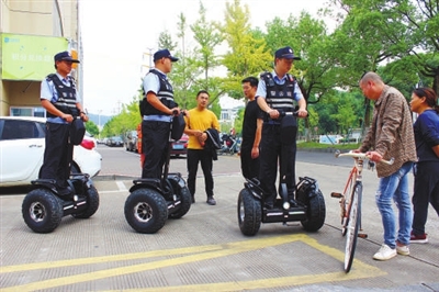 昨日上午,台州市公安局椒江分局区西派出所民警脚踩平衡车在大街小巷、社区村居、沿街商铺等地开展治安巡逻和“三服务”活动,随时接受群众询问和报警求助,增强群众安全感和满意度。