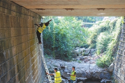 目前,在江山205国道,221、315省道干线公路上,重型货车载货量大,重点路段车流量密集,对桥梁安全运行造成隐患,为此江山公路段对全市50多座重点桥梁开展安全“体检”。图为工作人员正对205国道化龙溪桥检测。毛建华