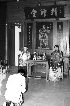 从堂前绕过,我们又来到了前庭的拜师房。拜师房是专门举行拜师仪式的地方。以前手工艺者收徒授艺,非常注重收徒仪式,以示庄重。据悉,被选入国家级非物质文化遗产名录的岑氏木船作坊的岑全富老先生,就曾在这个拜师房里举行过收徒仪式,现场收下了徒弟金健民,希望徒弟将传统木船制造技艺发扬光大。现在拜师房里还陈列着一份当年他们中规中矩的拜师契约。这种契约我以前从没见过,真是让人大开了眼界。