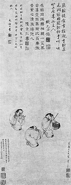 第三个题诗的是书画家文谦光。诗曰:“形模相肖更相亲,会聚三驼似有因。却羡渊明归思早,世途只见折腰人。”他认为,当时现实社会里不为斗米折腰的陶渊明似乎真的绝迹了,大家看到的多是委曲求全的苟且之人。