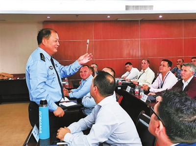 近日,全国优秀人民警察、全国公安机关爱民模范、全国公安系统二级英模、台州市公安局椒江分局海门派出所社区民警阮林根应邀来到浙江警察学院,与2019年阿根廷打击有组织犯罪研修班的警察同行就“社区安全防范”课题进行面对面交流。