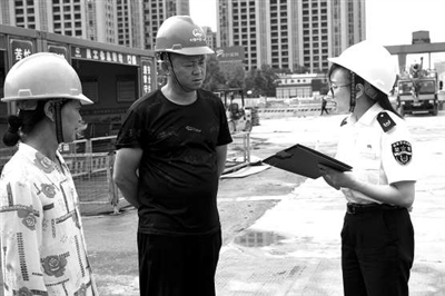 | 章欢欢(右一)在建筑工地检查时,向民工询问工资发放情况。 |