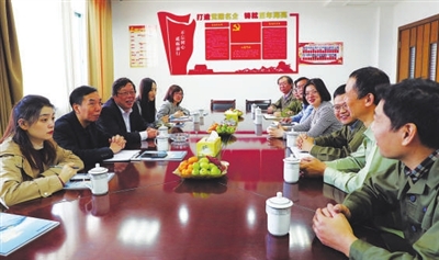 | 11月8日记者节当天,本报总编辑郦卓均(左三)带领采访小组深入海亮集团,以践行“四力”的独特方式,庆祝第20个记者节。 记者邹伟锋 摄 |
