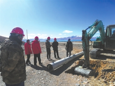 | 公司援藏党员在当地商讨电力线路架设工程。 |