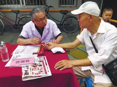 | 上海中医药大学杭州吾安中医门诊部退休的王医师(左)正在为社区老人志愿服务。 |