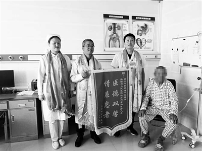 经与患者及家属沟通,胡海平对其给出行经尿道前列腺等离子剜切术的手术建议。术后5天,患者拔除尿管且排尿通畅。为表感激,家属送来了一面锦旗和一条长长的哈达。