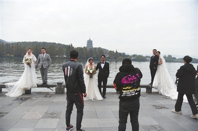 昨日,十多对新人排着队在杭州长桥公园的长桥上等待拍摄婚纱照,此地已成为新人拍婚纱照的好景点。