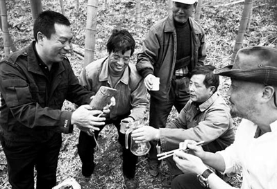 | 黎鹰(右一)与伙伴们分享竹鲜酒。 |