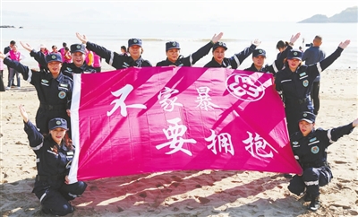 “不家暴,要拥抱”“要拥抱,反家暴”……11月25日是“国际反家庭暴力日”,昨日上午,玉环市首届“反家暴”主题宣传沙滩课堂在坎门后沙黄金沙滩上开课,玉环市妇联、坎门街道巾帼志愿者、公安女警、海韵女子巡防队等100多人相聚在一起,通过接力签名、宣讲反家暴课等形式,宣传倡导反对家庭暴力,创建平安家庭,家和万事兴,构建社会大和谐。