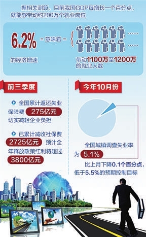 数据显示,今年前三季度,我国GDP保持了6.2%的增速。这一增速虽然没有前些年那么高,但随着GDP总量的不断扩大,GDP每增长1个点,对就业的拉动作用也相应增强。据相关测算,目前我国GDP每增长1个百分点,能够带动约200万个就业岗位。6.2%的经济增速,意味着带动1100万至1200万的就业人数。