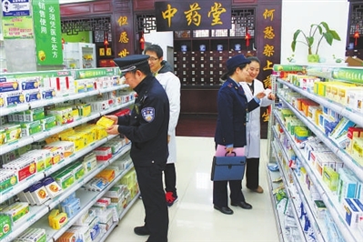 昨日上午,台州市椒江区市场监督管理局海门市场监督管理所会同台州市公安局椒江分局海门派出所,对辖区内的药品零售药店的药品质量、药品进货渠道、药店购买销售台账等进行检查,并提醒药店销售人员要诚信经营,严禁出售假冒伪劣或过期药品,确保广大群众用药安全。