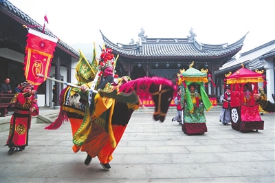 11月27日,2019临海·温岭非遗走亲活动在临海市非遗传承中心(灵湖得月园)举行,此次活动由临海市和温岭市文广旅体局主办。当天下午,温岭、临海两地的大奏鼓、临海词调、温岭洞房经、温岭提线木偶戏、临海黄沙狮子等非遗节目轮番上演。此次活动让温岭、临海两地传承人之间有了一个交流机会,也让临海市民感受到两地非遗的魅力。图为临海大石车灯戏《关公送皇嫂》。