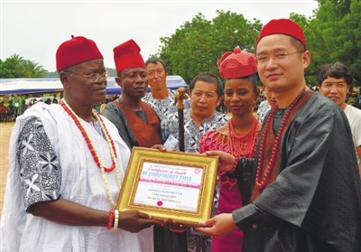 尼日利亚时间11月2日上午10时,在祷告声和1000多人的注目礼中,礼仪官为中国小伙干嘉璇穿上代表酋长身份的特制酋长袍;尼日利亚科吉州土皇给干嘉璇戴上酋长专属红帽子,将酋长证书和象征酋长权力的权杖交给干嘉璇,加冕其为“GBELUNIYI OF BAGIDO LAND”酋长。至此,温岭青年干嘉璇在尼日利亚扎下根基,成为一名终身制可世袭酋长,这是第一位被册封为酋长的台州人。
