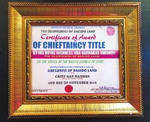 半个小时后,当公布投票结果时,会议厅里响起热烈持久的掌声。27名到会酋长全票通过,科吉州土皇穆塞斯·安东比决定册封中国青年干嘉璇为终身制可世袭的“GBELUNIYI OF BAGIDO LAND”酋长,并于三天后举行授封加冕仪式。