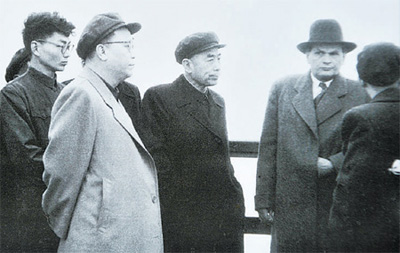 | 上世纪50年代,本报记者宋哲(左一)参加国家外事活动采访。右三为周恩来总理。 |