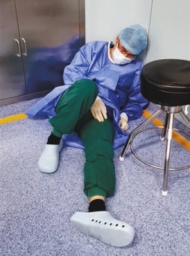 照片中,这位坐在地上睡着的医生是博鳌超级医院国际眼视光眼科中心主任、温州医科大学附属眼视光医院院长助理陈蔚。整整一天的手术,让他累倒了,还没摘下手套和口罩,就瘫靠在墙上睡着了。一旁的医生用手机记录下这个感人的瞬间。