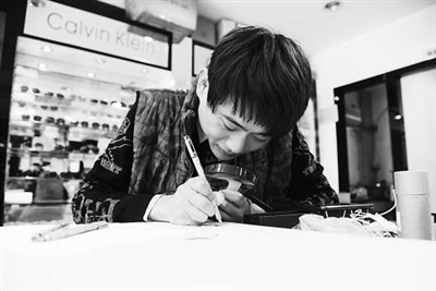 毕业之后,朱克伟就在家里的眼镜店帮忙,空闲时就在柜台上静静地画画,他说,很享受在眼镜店里自由创作的状态。通讯员连国庆 摄
