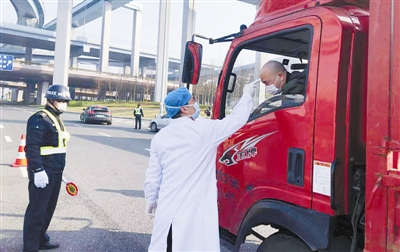 图为志愿者给过往司机检测体温。