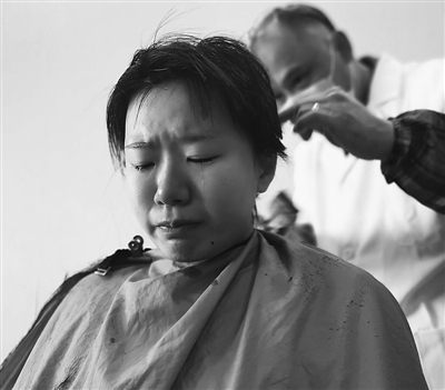 2月9日下午,宁海县第二批医护人员驰援武汉。出征前,宁海县妇幼保健医院护士为了工作便利纷纷剪去长发。图为护士马晓雪哭着和自己的齐胸长发说“再见”。