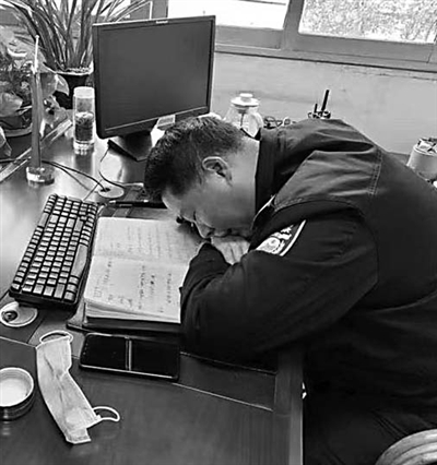 本报讯 通讯员林利军、金双双 记者潘仙德报道 近日,抗击疫情的基层派出所所长杨普营坐在办公桌前写材料时累到睡着了,照片被民警拍下传到局里工作群,同事们看后特别心疼。