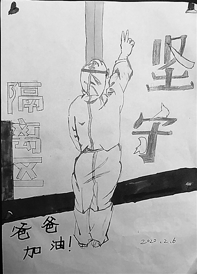 手记中提到因为工作太忙的缘故,陈金锦一直没有机会拍一张防护服工作照。得知爸爸的想法后,2月6日,陈金锦10岁的儿子为爸爸画了一幅逆行背影画,并写上了一句话,“隔离区坚守,爸爸加油!”“爸爸,你的背影真高大!”看到儿子的画作、听到儿子由衷的赞美,陈金锦湿了眼眶……